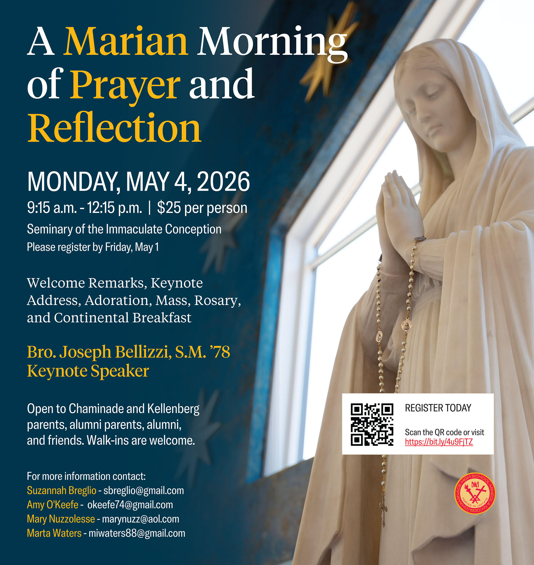 Seminary of the Immaculate Conception Please register by Friday, May 1 Welcome Remarks, Keynote Address, Adoration, Mass, Rosary, and Continental Breakfast Bro. Joseph Bellizzi, S.M. ’78 Open to Chaminade and Kellenberg parents, alumni parents, alumni, and friends. Walk-ins are welcome. For more information contact: |